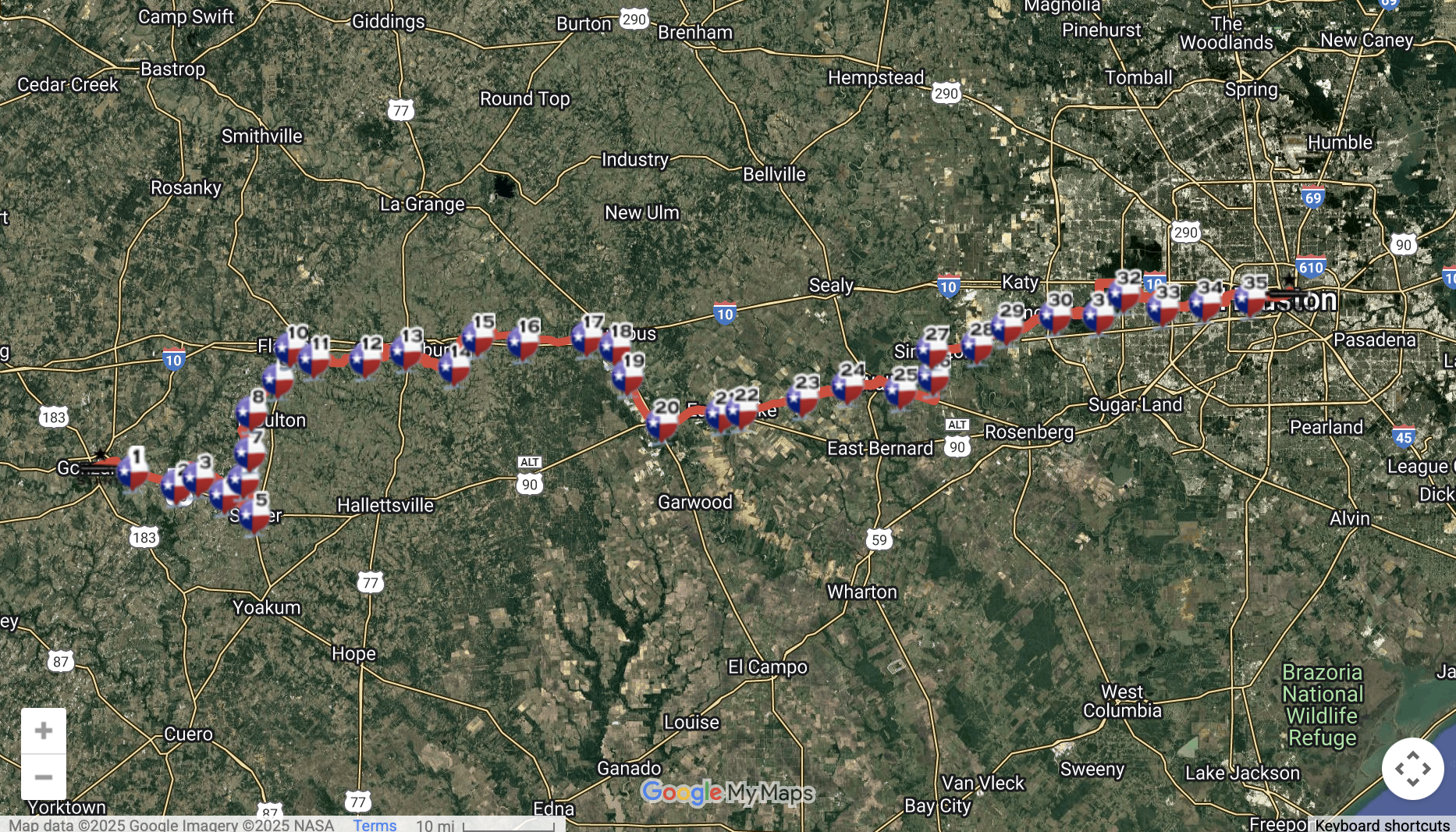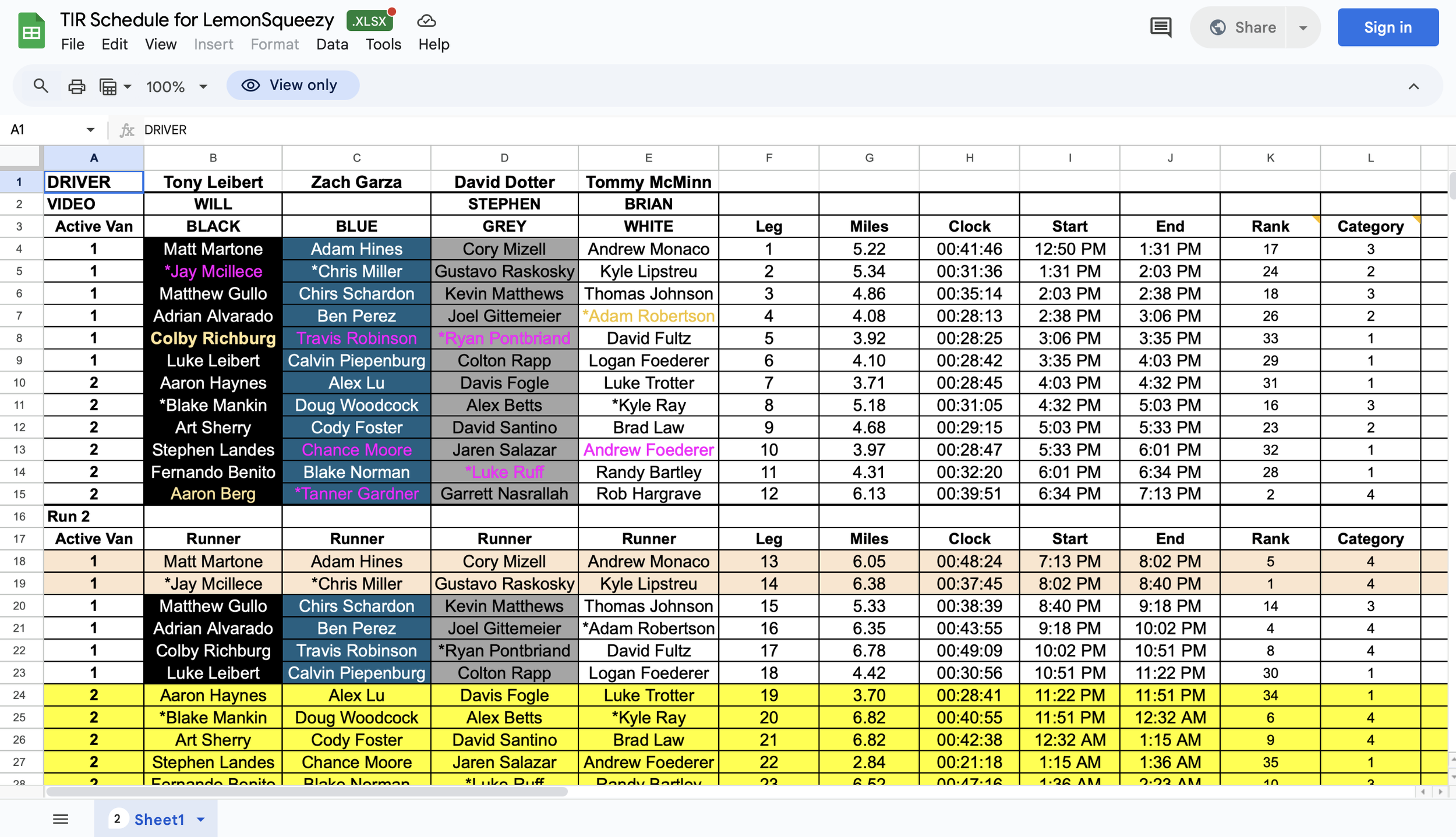 minute-by-minute relay running schedule. color coded for each team, captain, and interviewee
